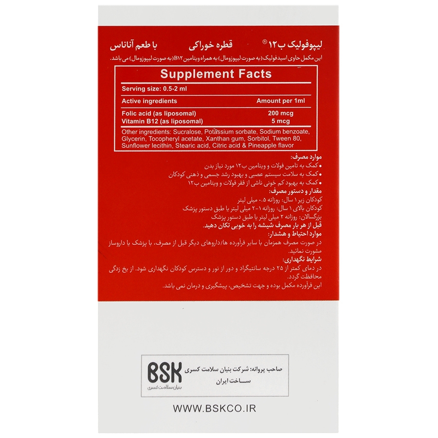 لیپوفولیک ب12، محصولی به فرم لیپوزومال با جذب و فراهمی زیستی بالا کمک به تامین ویتامین ب9 و ب12 و حفظ سلامت سیستم عصبی دارای اثرات مطلوب در بهبود رشد جسمی و ذهنی کودک کمک به بهبود کم خونی ناشی از کمبود B9 و B12 فاقد گلوتن، الکل و رنگ مصنوعی قطره لیپوفولیک B12، با طعم دلپذیر آناناس مناسب برای نوزادان، کودکان و بزرگسالان
