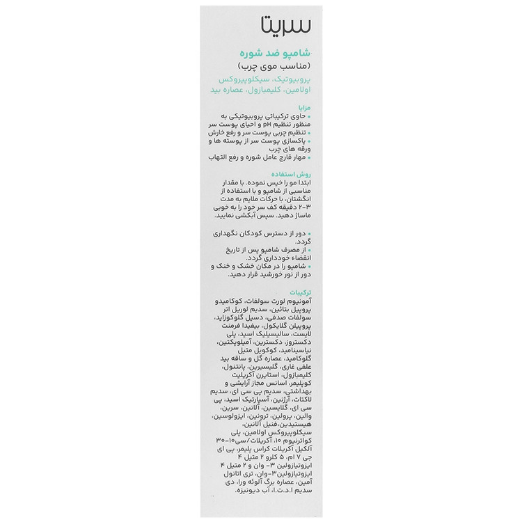 شامپو ضد شوره سریتا برای موهای چرب، مکانیسم تولید شوره سر را به گونه ای موثر و منحصر به فرد کنترل کرده و در درمان و کاهش آن موثر است. این محصول با کنترل ترشح چربی، از رشد میکروارگانیسم های مولد شوره، از جمله قارچ مالاسزیا و برخی از باکتری ها جلوگیری کرده و خارش پوست سر را رفع میکند. شامپو ضد شوره چرب سریتا با کنترل تکثیر سلول های پوست سر، سبب کاهش پوسته ریزی شده و با استفاده از ترکیبات لایه بردار ملایم سبب پاکسازی پوست سر و کاهش ورقه های چرب کمک میشود. این فرآورده دارای ترکیبات التیام بخش و ضد التهاب بوده و در بهبود و جلوگیری از ایجاد درماتیت سبورئیک موثر است.