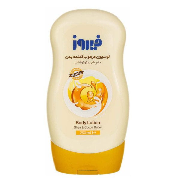 - لوسیون بدن فیروز برای پوست خشک حاوی رایحه مطبوع کره کاکائو و شی باتر