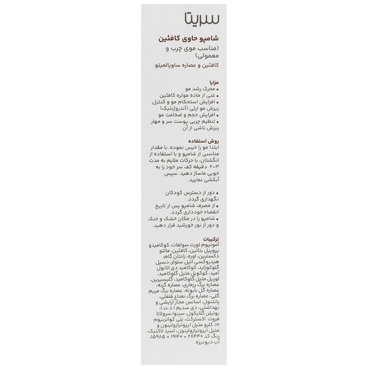 شامپو کافئین سریتا یک شوینده تخصصی برای کنترل ریزش موی ارثی (آندروژنتیک)، افزایش ضخامت و استحکام مو و تنظیم چربی پوست سر است. فرمولاسیون این شامپو حاوی ترکیبات گیاهی و تقویتکننده مو مانند کافئین، عصاره ساوپالمتو، رزماری، گزنه و بابونه است که ضمن کاهش ریزش مو، به افزایش رشد مجدد تارهای ضعیفشده و تقویت فولیکولها کمک میکنند. این محصول بافت ملایمی دارد و برای انواع مو، بهویژه موهای نازک، کمحجم و مستعد ریزش طراحی شده است.