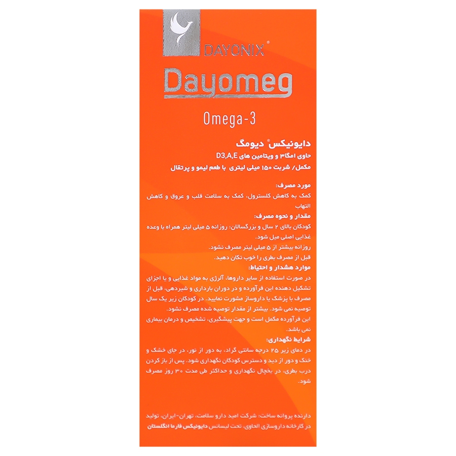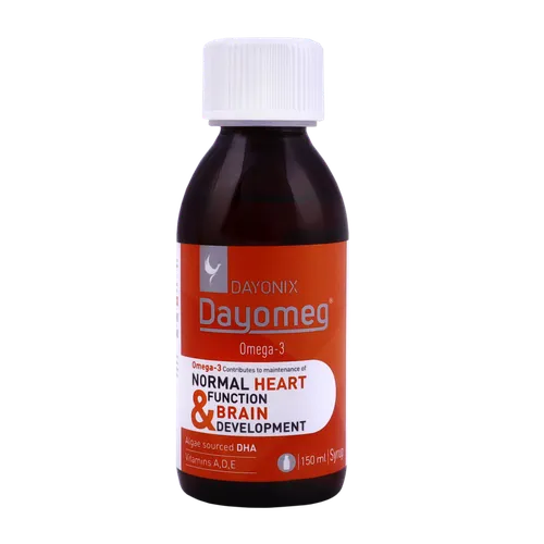 شربت دایونیکس دیومگ حاوی امگا3 گیاهی مشتق شده از روغن جلبک دارای 250 میلیگرم دی اچ آ، 10 میکروگرم ویتامین د3، 588 میکروگرم ویتامین A و 14.9 میکروگرم ویتامین E به ازای هر 5 میلیلیتر کمک به حفظ سلامت قلب و عروق، تکامل طبیعی مغز و سلامت سیستم بینایی مفید جهت کاهش تریگلیسیرید خون و بهبود پروفایل لیپیدی دارای اثرات ضد التهابی و آنتیاکسیدانی مناسب مصرف کودکان بالای 2 سال و بزرگسالان