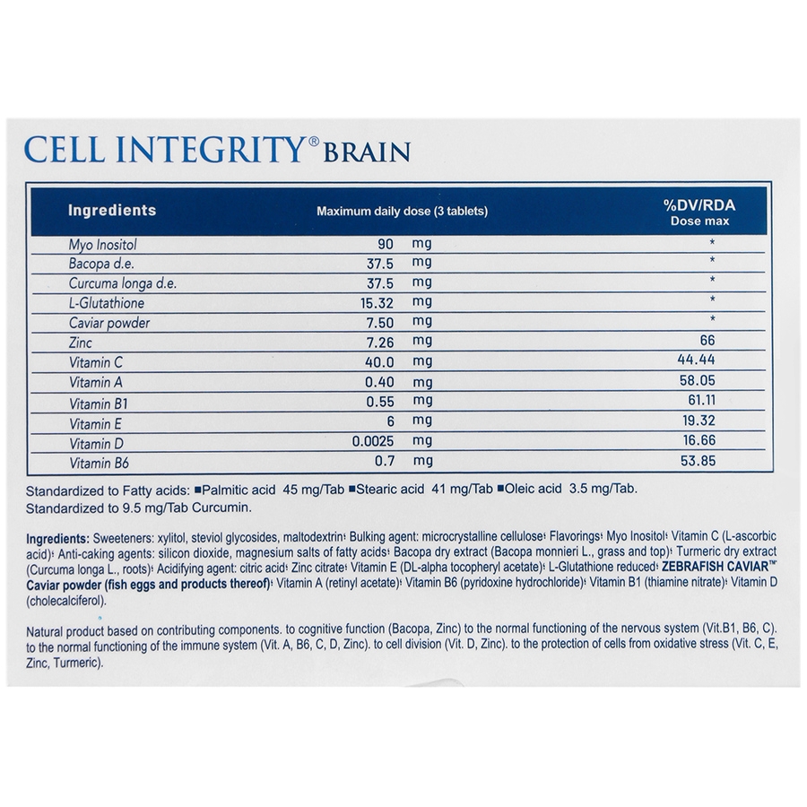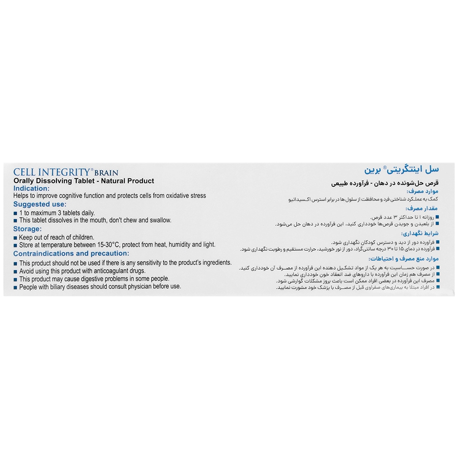 سل اینتگریتی برین، فرآورده طبیعی برای کمک به تقویت حافظه و تمرکز سل اینتگریتی برین، حاوی مولتیویتامین، زینک، مایواینوزیتول و گلوتاتیون در کنار پودر خاویار دارای عصاره گیاهان زردچوبه و باکوپا قرص سل اینتگریتی برین، استانداردشده براساس 9.5 میلیگرم ماده مؤثره کورکومین در هر قرص کمککننده به تقویت عملکرد شناختی دارای اثرات کمکی در حفاظت از سلولها در برابر استرس اکسیداتیو طراحیشده به فرم قرص حلشونده در دهان دارای شیرینکننده