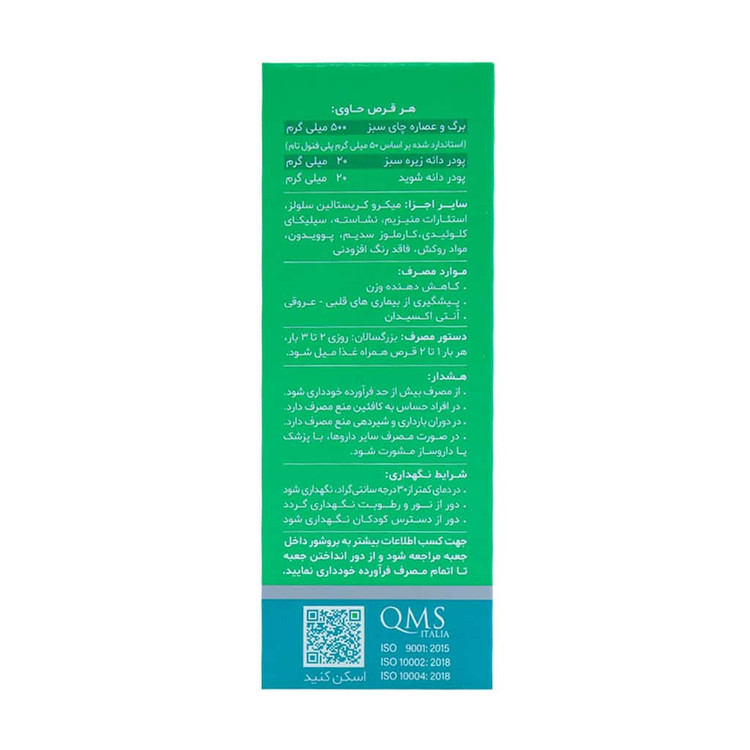- قرص گرین تیدین حاوی برگ و عصاره چای سبز، پودر دانه زیره سبز و پودر دانه شوید