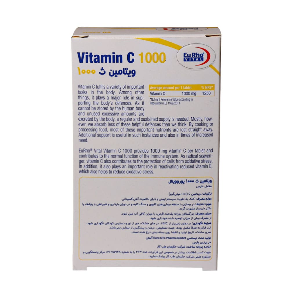 - قرص ویتامین c 1000 eurho vital، موثر در تحریک کلاژن سازی و حفظ سلامت پوست