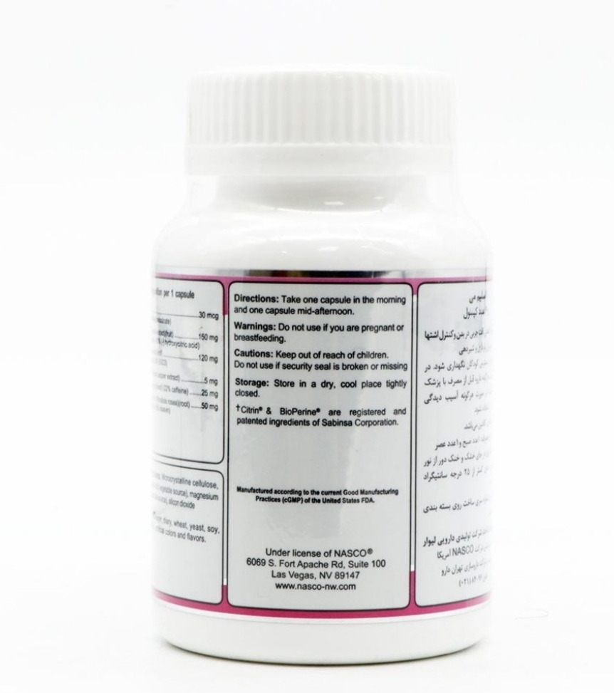 - اسلیم می حاوی کروم، عصاره چای سبز، گارسینیا، فلفل سیاه، رودیولا و گوارانا