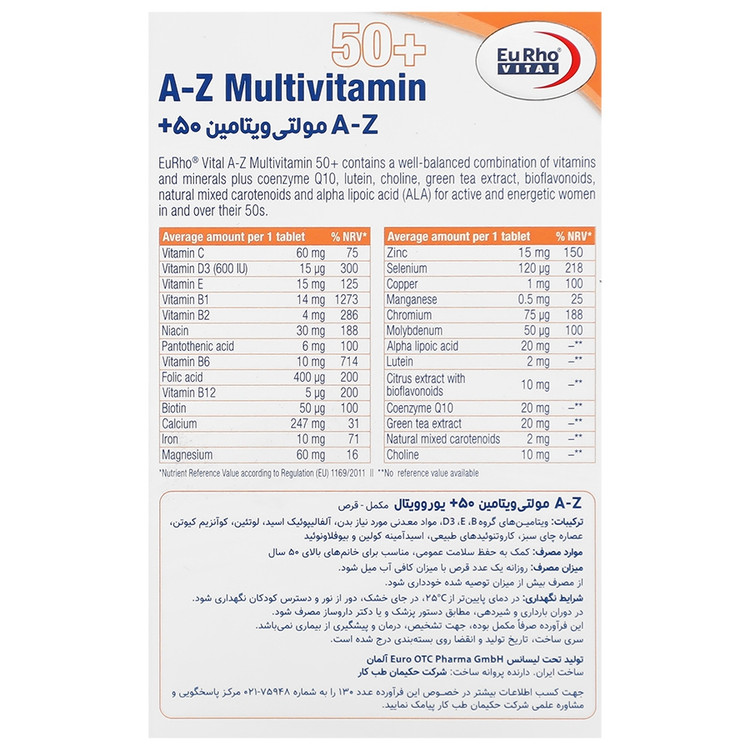 - میزان و بهترین زمان مصرف مولتی ویتامین a-z بالای 50 سال یوروویتال: روزانه 1 عدد قرص a-z multivitamin، همراه با غذا