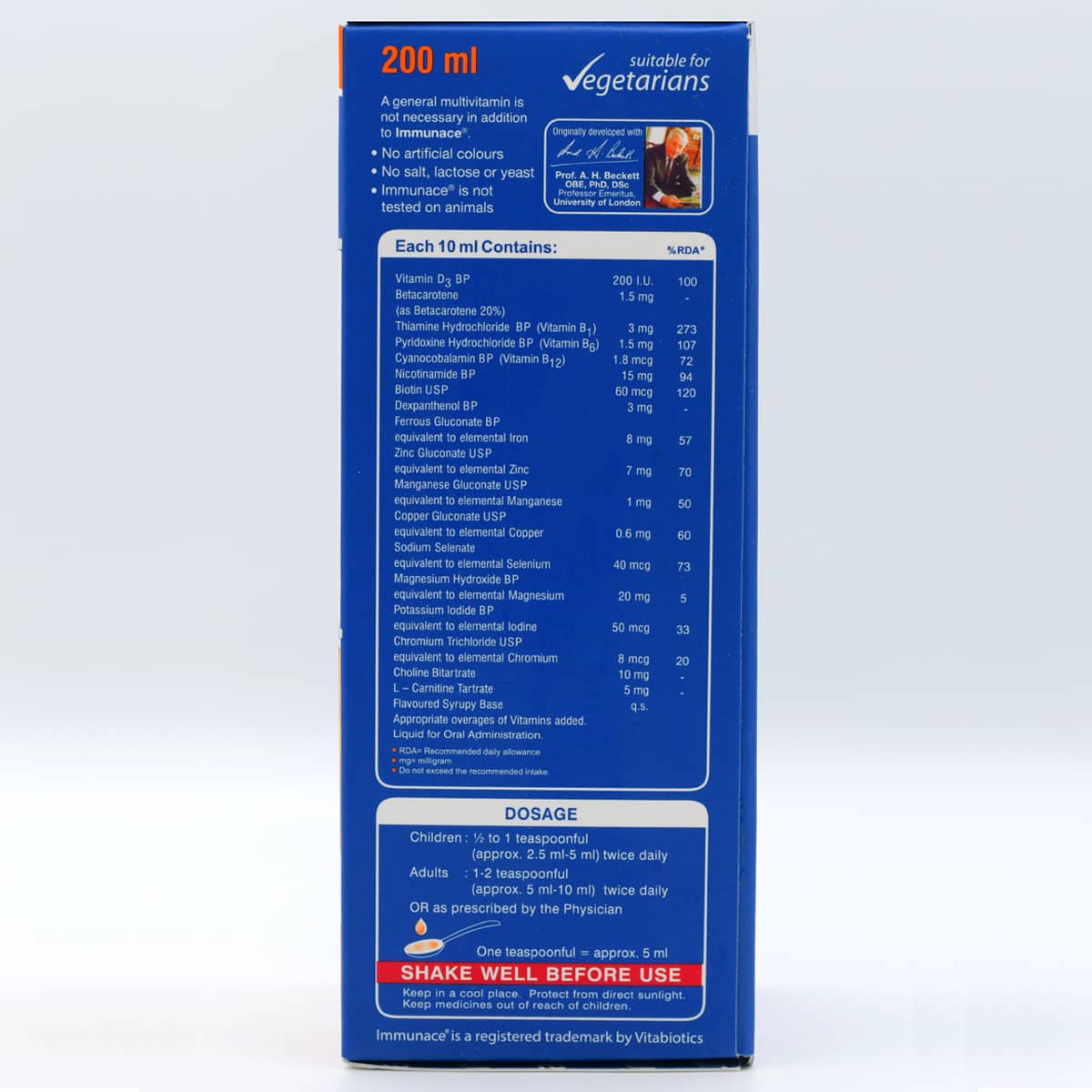 شربت ایمیونیس مولتی ویتامین تخصصی تقویت سیستم ایمنی بدن حاوی ویتامین ها، مواد معدنی و ال کارنیتین کمک به پیشگیری از ابتلا به بیماری ها مناسب کودکان، افراد بزرگسال و سالمندان فاقد رنگ مصنوعی، فاقد نمک، فاقد لاکتوز و فاقد مخمر قابل استفاده توسط افراد گیاهخوار هر بطری شربت ایمیونیس مناسب استفاده به مدت 20 تا 40 روز در کودکان می باشد. هر بطری شربت immunace مناسب استفاده به مدت 10 تا 20 روز در افراد بزرگسال می باشد.