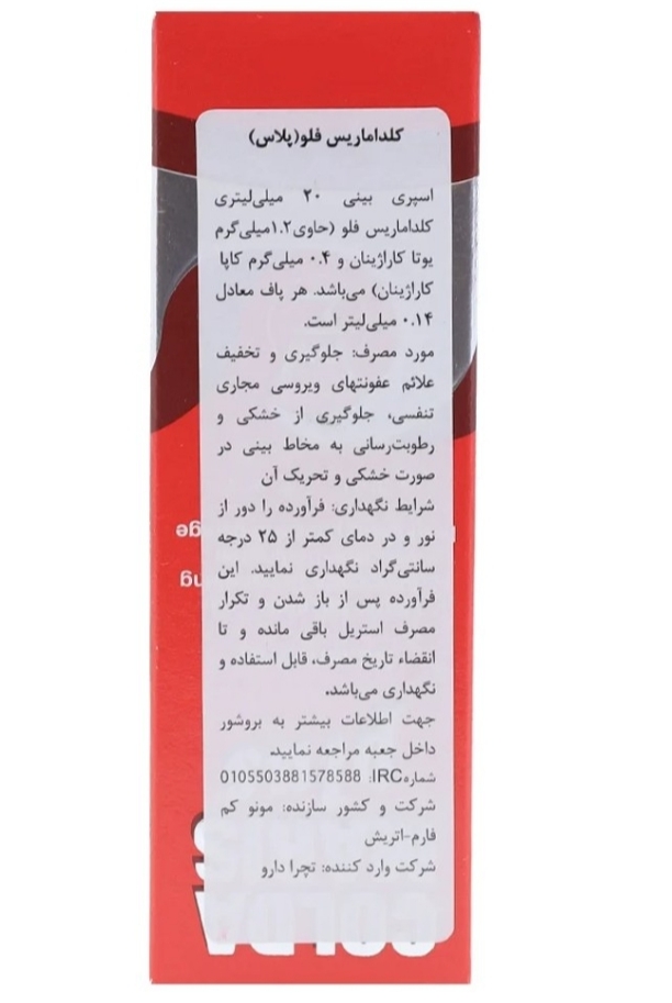 اسپری کلداماریس قرمز، اسپری بینی برای جلوگیری و تخفیف علائم عفونتهای ویروسی مجاری تنفسی اسپری کلداماریس قرمز، حاوی 1.2 میلیگرم یوتاکاراژینان و 0.4 میلیگرم کاپا کاراژینان در هر میلیلیتر قابل استفاده برای کمک به جلوگیری از خشکی بینی کلداماریس قرمز، کمککننده به رطوبترسانی به مخاط بینی در صورت خشکی و تحریک آن همراه با اثرات کمکی در کاهش علائم عفونتهای تنفسی ویروسی و باکتریایی بدون نگهدارنده