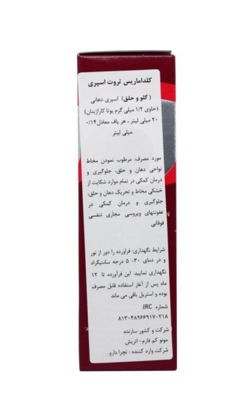 اسپری دهانی کلداماریس، حاوی کاراژینان یوتا ترکیب طبیعی مشتق از جلبک قرمز دریایی کمک به جلوگیری و درمان عفونتهای مجاری تنفسی فوقانی کمک به بهبود خارش و سوزش گلو ناشی از خشکی اسپری دهانی کلداماریس، مرطوب کننده و کمک کننده در رفع خشکی مخاط دهان و گلو کلداماریس دهانی، طعم دلپذیر گیلاس، پذیرش راحت تر توسط کودکان مناسب استفاده افراد ساکن محیط های خشک، افراد سیگاری، هنگام آواز خواندن و سخنرانی کردن فاقد رنگ، فاقد مواد نگهدارنده اسپری دهانی کلداماریس تروت، قابل استفاده در کودکان بالای 1 سال و بزرگسالان
