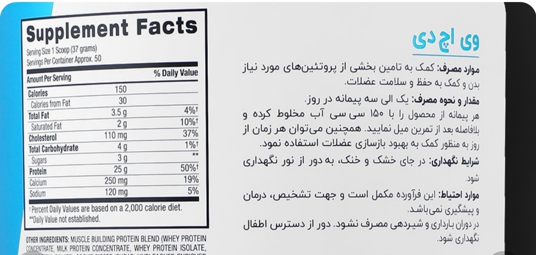 وی بی پی ای، حاوی 25 گرم پروتئین وی کنسانتره و ایزوله در هر سروینگ (37 گرم) وی بی پی ای، موثر در تامین بخشی از پروتئین مورد نیاز روزانه بدن کمک به حفظ، ترمیم و رشد عضلات دارای کلسیم به منظور حفظ سلامت استخوانها پروتئین وی اچ دی بی پی ای، قابل استفاده در دوره حجم بدنسازی قابل استفاده توسط افراد غیر ورزشکار برای تامین پروتئین