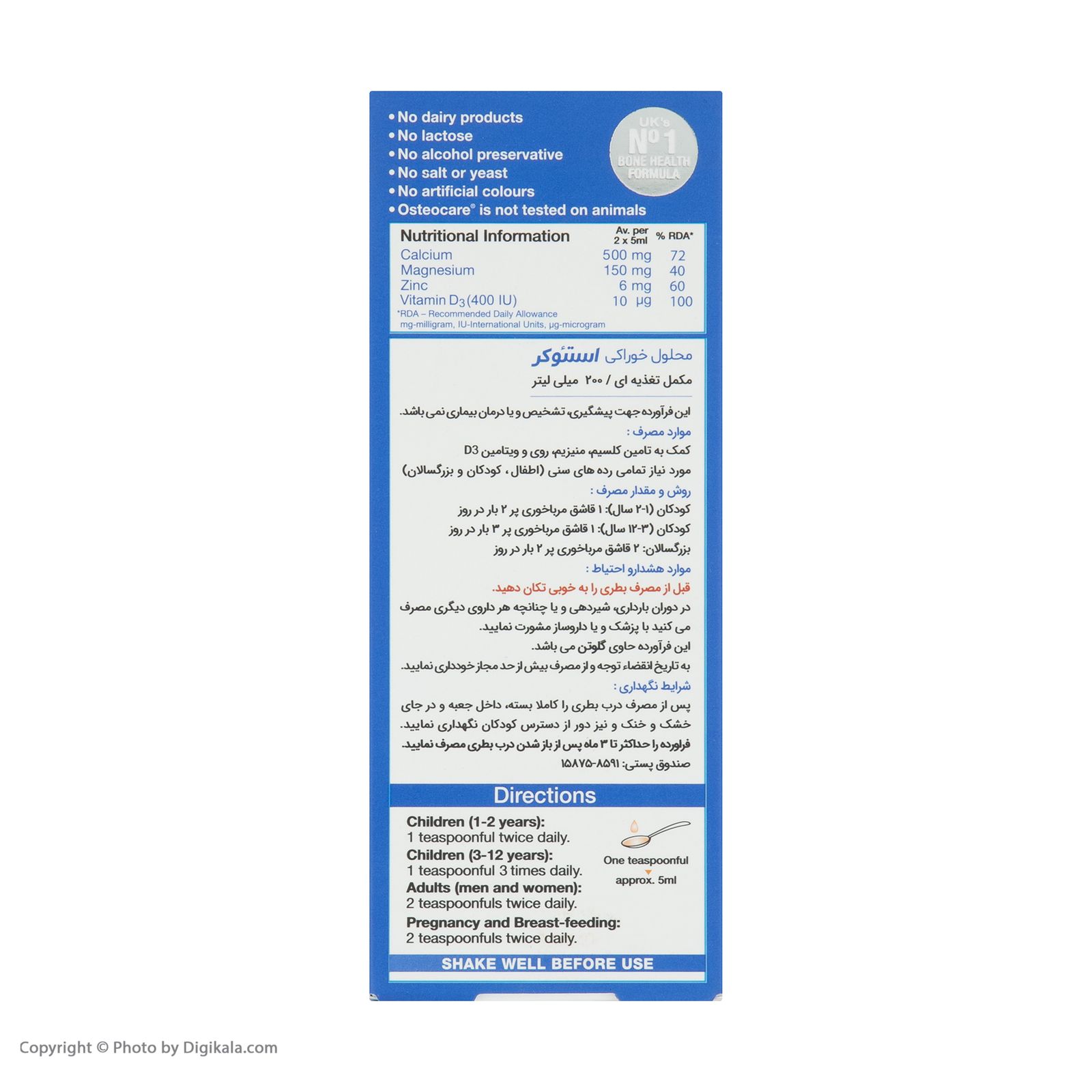 شربت استئوکر حاوی کلسیم، منیزیم، زینک و ویتامین D3 برای حفظ سلامت استخوان قابل استفاده در کودکان بالای 1 سال، نوجوانان و افراد بزرگسال تامین کلسیم مورد نیاز بدن و افزایش استحکام استخوان ها و دندان ها شربت osteocare در افزایش رشد قدی نوجوانان موثر است. با طعم پرتقال قابل استفاده توسط افراد گیاهخوار نیازی به قرار دادن شربت استئوکر در یخچال نمی باشد. فاقد لبنیات، فاقد لاکتوز، فاقد الکل، فاقد نمک مخمر و فاقد رنگ مصنوعی هر بطری شربت استئوکر مناسب استفاده به مدت 20 روز در کودکان 1 تا 2 سال می باشد. هر بطری شربت استئوکر مناسب استفاده به مدت حدودا 13 روز در کودکان 3 تا 12 سال می باشد. هر بطری شربت استئوکر مناسب استفاده به مدت 10 روز در افراد بزرگسال می باشد.