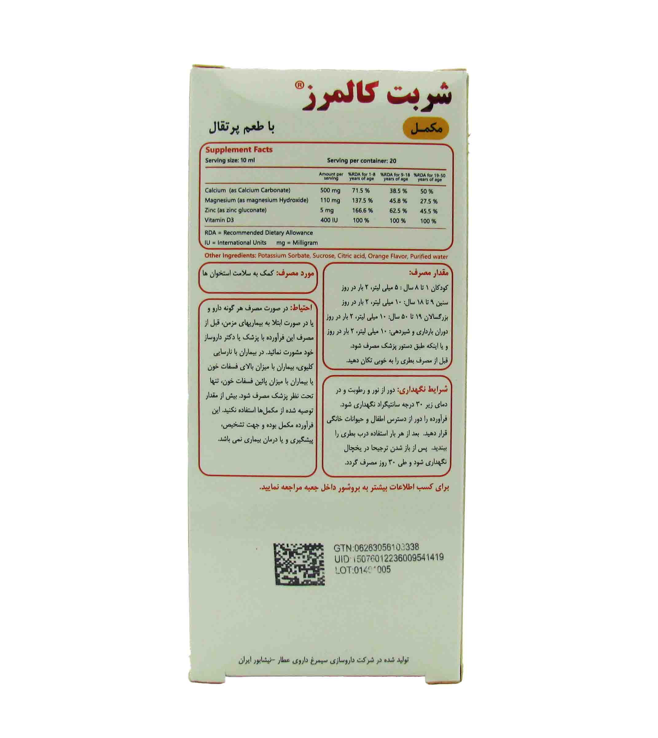 شربت کالمرز، حاوی کلسیم به فرم کربنات به همراه منیزیم، زینک و ویتامین D شربت کالمرز، مکمل تخصصی جهت حفظ سلامت استخوان های کودکان کمک به حفظ تراکم استخوان ها و استحکام دندان های کودک شربت Calmerz، موثر در پیشگیری از ابتلا به پوکی و نرمی استخوان قابل استفاده در کودکان بالای 1 سال، نوجوانان، بزرگسالان و بانوان باردار و شیرده با طعم دلپذیر پرتقالی