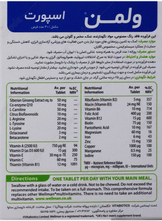 - نحوه مصرف wellman sport: روزانه 1 عدد قرص همراه با غذا