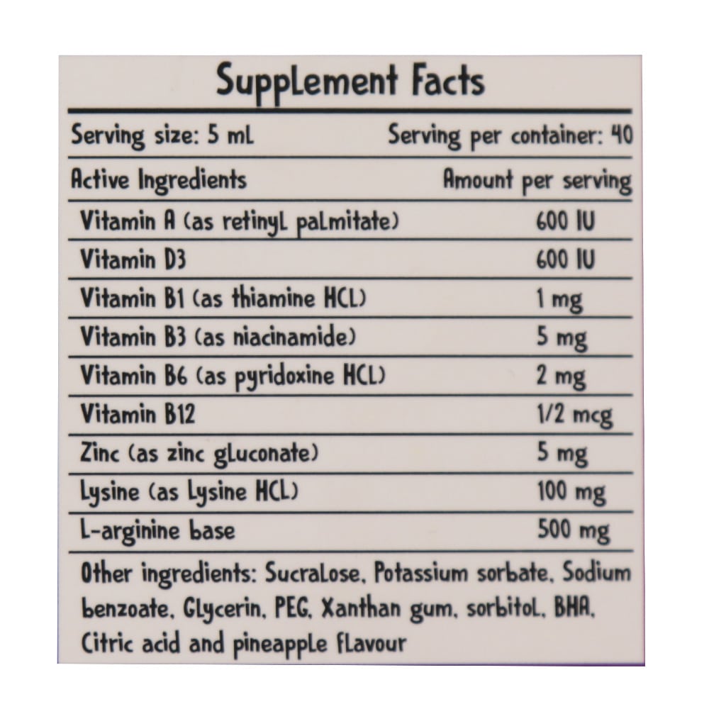- حاوی ال آرژنین، لیزین و زینک به همراه مولتی ویتامین
