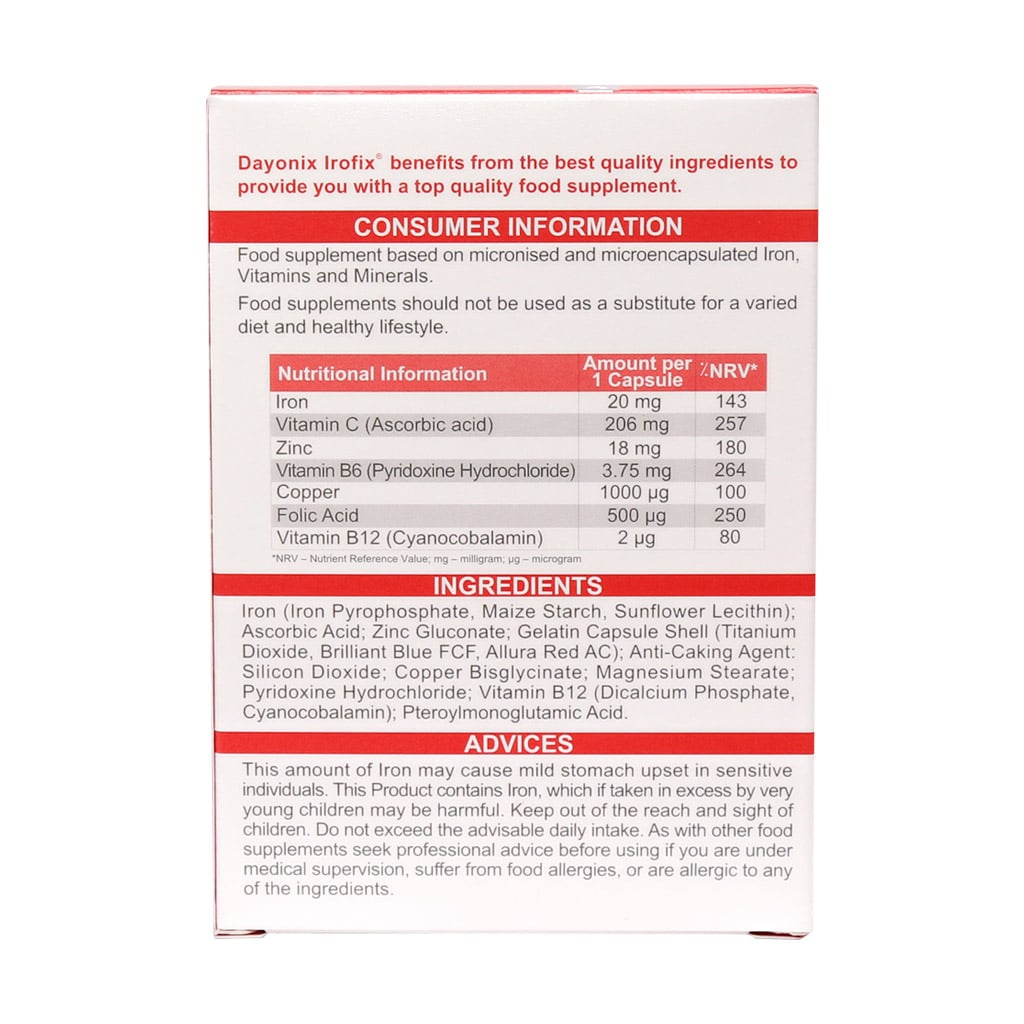 کپسول آیروفیکس حاوی آهن میکروکپسول پیروفسفات به فرم لیپوزومال دارای عارضه گوارشی کمتر نسبت به برخی دیگر از فرم های آهن کمک به تامین آهن مورد نیاز بدن Irofix حاوی ویتامین C برای کمک به افزایش جذب آهن کمک به ساخت گلبول های قرمز با دارا بودن مس، ویتامین B6، فولیک اسید و ویتامین B12 کمک به پیشگیری از ابتلا به کم خونی فقر آهن کپسول ایروفیکس دارای زینک به علت نقش در مسیر ساخت هموگلوبین کمک به بهبود علائم آنمی هر بسته کپسول آیروفیکس مناسب استفاده به مدت 30 روز می باشد.
