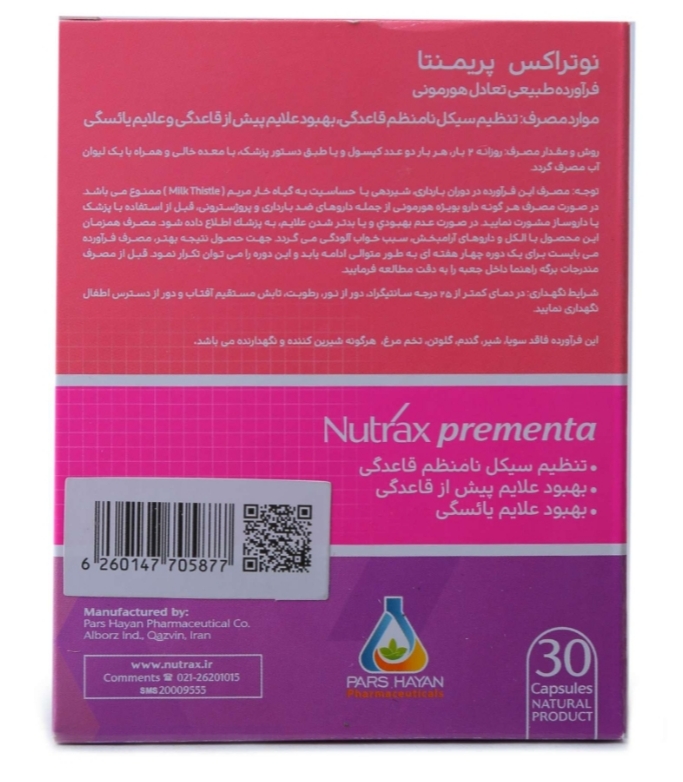 ریمنتا فرآورده ی طبیعی برای حفظ تعادل هورمونی بانوان حاوی گیاهان پنج انگشت، ساوپالمتو، خارمریم و ... پریمنتا موثر در بهبود کرامپ و دردهای قاعدگی تنظیم سیکل نامنظم قاعدگی و کاهش علائم سندرم پیش از قاعدگی کپسول پریمنتا موثر درپیشگیری از نوسانات استروژنی و پرولاکتینی کاهش علائم یائسگی با داشتن ترکیبات فیتواستروژنی کپسول prementa موثر در بهبود نوسانات خلق و خو، سردرد، اضطراب، نفخ و حساسیت سینه در بانوان فاقد سویا، شیر، گندم، گلوتن، تخم مرغ، شیرین کننده و نگهدارنده کپسول پریمنتا نوتراکس 30 عدد مناسب برای گیاهخواران