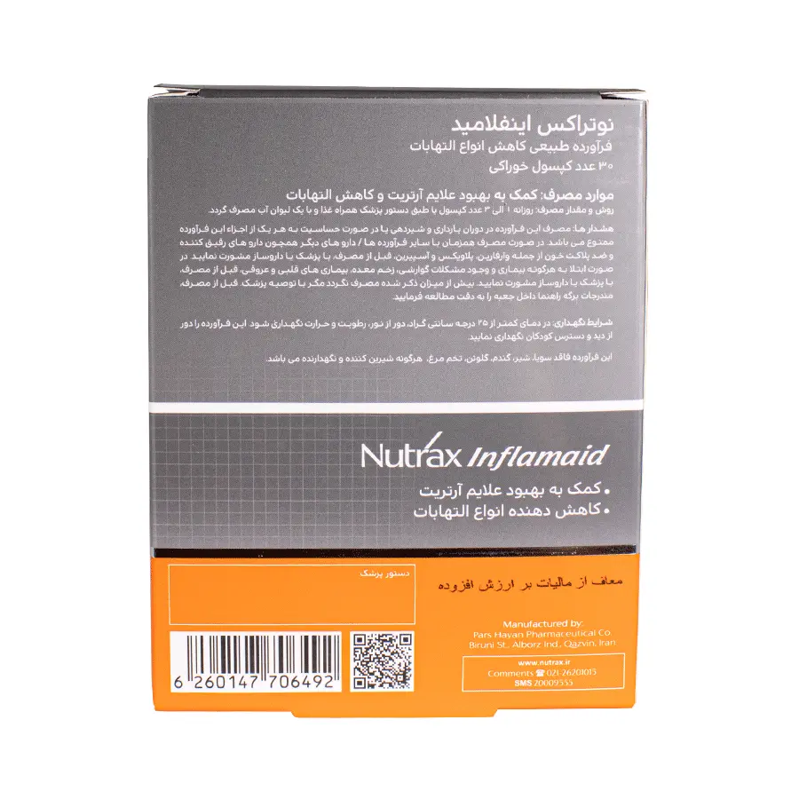 اینفلامید، فرآورده طبیعی موثر در سلامت استخوان و مفاصل تورمریک، بروملائین، عصاره باسولیا از اجزای تشکیل دهنده اینفلامید می باشند. کپسول اینفلامید، کاهش دهنده درد و التهاب مفاصل کمک به کاهش علائم آرتریت کپسول اینفلامید، کمک به بهبود وضعیت آنتی اکسیدانی بدن فاقد سویا، فاقد شیر، فاقد گندم و گلوتن، تخممرغ هرگونه شیرین کننده و نگهدارنده