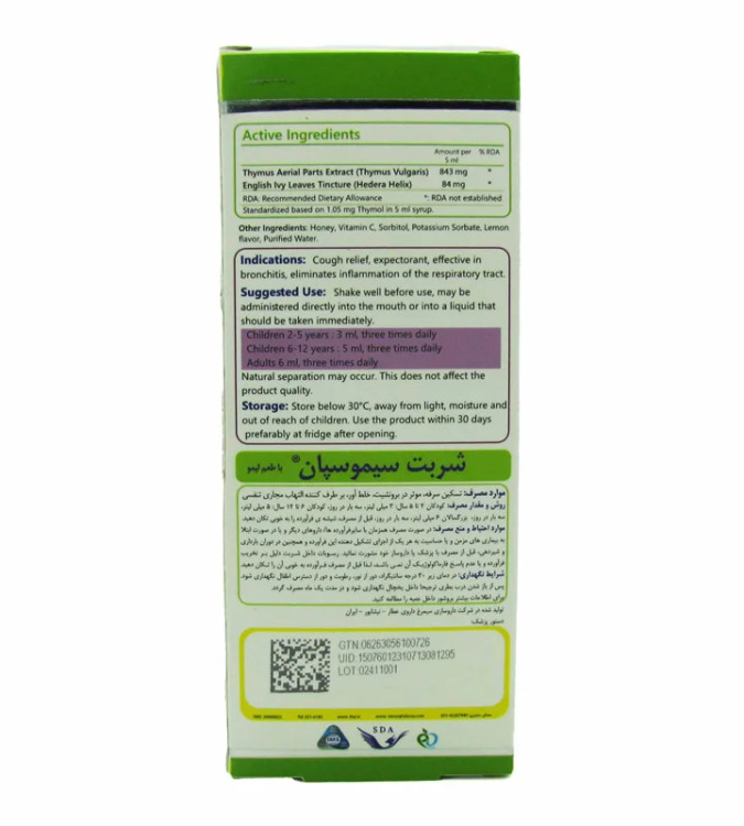 - سیموسپان کمک به تسکین سرفه های خشک به علت وجود گیاهان آویشن و عشقه و ترکیب طبیعی عسل