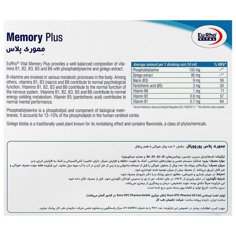 - مموری پلاس یوروویتال، حاوی فسفاتیدیل سرین، عصاره گیاه جینکوبیلوبا، ویتامینهای B2،B1، نیاسین، پانتوتنیک اسید و ویتامین B6