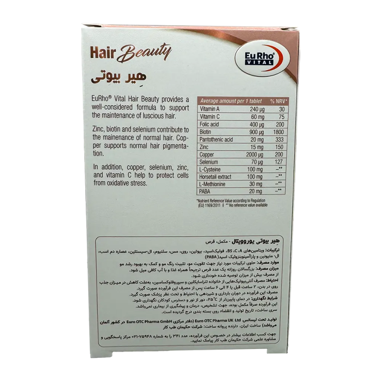 - قرص هیر بیوتی، کمک به تقویت فولیکولهای مو با ۹۰۰ میکروگرم بیوتین و ۱۵ میلیگرم زینک برای کاهش نازک شدن و ریزش مو