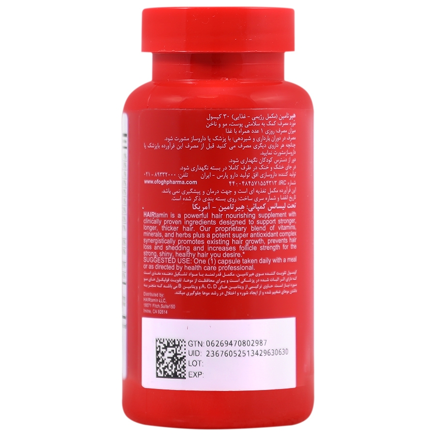 - کپسول هیرتامین دارای دوز بالای بیوتین برای کمک به تحریک تولید کراتین در مو