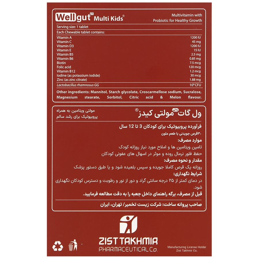 ول گات مولتی کیدز، پروبیوتیک به همراه مولتی ویتامین مخصوص کودکان کمک به حفظ فلور نرمال روده مقابله با اسهالهای عفونی کودکان مفید برای حفظ و بهبود سلامت دستگاه گوارش کمک به تامین ویتامینها و مواد معدنی و رشد نرمال کودک قرص ول گات مولتی کیدز، مناسب برای کودکان 3 تا 12 سال به فرم جویدنی با طعم ملون، فاقد گلوتن،قند و لاکتوز