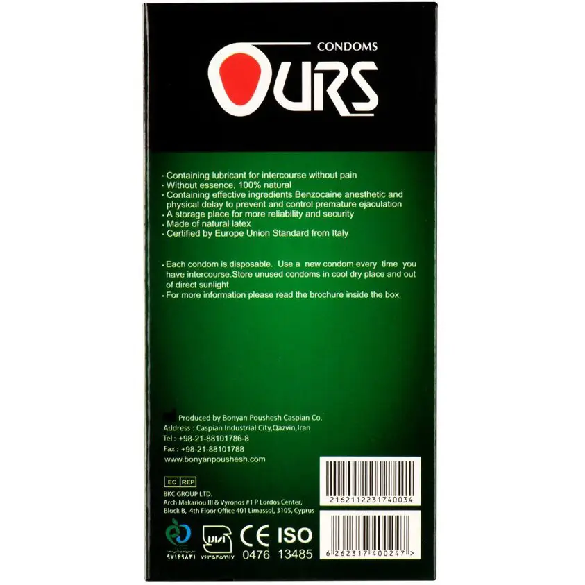کاندوم تاخیری OURS حاوی مواد روان کننده موثر جهت مقاربت بدون درد و افزایش تحریک پذیری است. سطح این محصول صاف و فاقد هرگونه شیار، خار و زبری است. این محصول فاقد هر گونه اسانس، دارای مخزن ذخیره جهت اطمینان و امنیت بیشتر و ساخته شده از لاتکس طبیعی است. فاکتور اصلی این کاندوم وجود مواد موثر تاخیری استاندارد (بنزوکائین) و تاخیر فیزیکی برای جلوگیری از انزال زودرس می باشد. استفاده از کاندوم های تاخیری امکان معاشقه طولانی مدت را برای طرفین تسهیل می نماید. متخصصان عرصه سلامت استفاده از کاندوم در روابط جنسی را به شدت توصیه میکنند تا از یک طرف جلوی بارداریهای ناخواسته گرفته شود و هم از سوی دیگر، احتمال انتقال بیماریهای مقاربتی از جمله اچ آی وی از بین برود. کاندوم های برند اورز (OURS) با در نظر داشتن آناتومی و مشخصه های فیزیولوژیکی مصرف کننده ایرانی و خاورمیانه طراحی و تولید گردیده است. در راستای ارایه محصولی با کیفیت استانداردهای ملی و جهانی، تمامی مجوزهای لازم از وزارتخانه های صنایع ، بهداشت و درمان و موسسه استاندارد و تحقیقات صنعتی ایران توسط این برند معتبر اخذ گردیده اند. شرکت تولید کننده کاندوم های برند اورز موفق به اخذ استاندارد اتحادیه اروپا (CE) گردیده است تا تاییدی دیگر بر کیفیت محصولات تولیدی باشد.