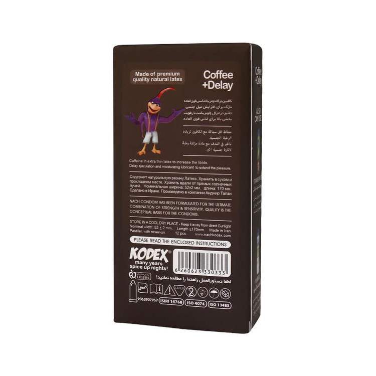 کاندوم تاخیری کافئین دار کدکس از لاتکس فوق العاده نازک ساخته شده است. این کاندوم برای افزایش میل جنسی گزینهای مناسب به نظر میرسد. این کاندوم مخصوص افرادی است که از بو و طعم کافئین لذت میبرند. بنابراین اگر بوی قهوه برای شما لذت بخش است خرید کاندوم تاخیری لذت رابطه را برای شما افزایش میدهد. برخی از زوجین به دلیل اینکه در گذشته از کاندومهایی با جنس نامرغوب استفاده کردهاند، دیگر میلی به استفاده از این محصول ندارند. اما همین افراد اگر از کاندومهای جنس لاتکس استفاده کنند، دیگر نسبت به استفاده از کاندوم بی میل نخواهند بود.