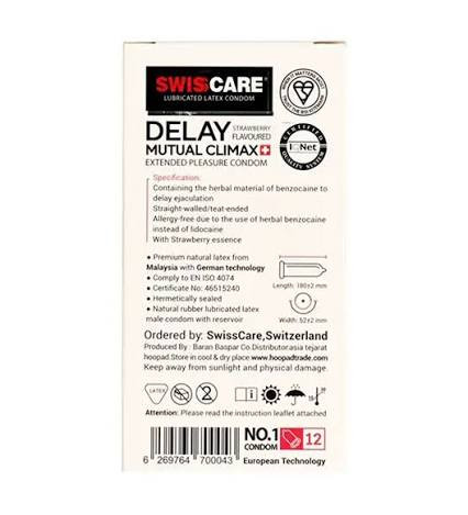 کاندوم تاخیری سوئیس کر مدل Delay Mutual Climax به تاخیر در انزال کمک نموده و باعث افزایش لذت در رابطه جنسی میشود. رایحه توت فرنگی این محصول ایجاد حس بهتری را برای زوجین به دنبال دارد.