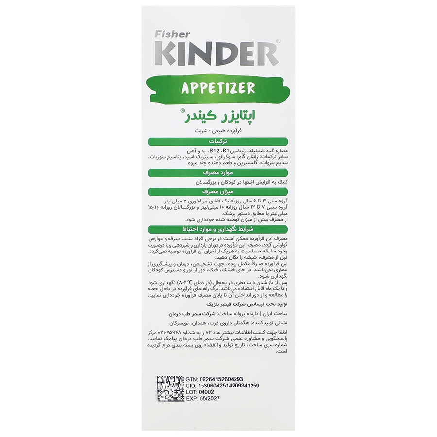 عصاره گیاه شنبلیله،ویتامین B1،B12،ید و آهن ترکیبات زانتان گام،سوکرالوز،سیتریک اسید،پتاسیم سوربات،سدیم بنزوات،گلیسرین و طعم دهنده چند میوه کمک به اشتها در بزرگسالان و کودکان