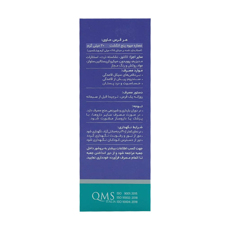 - قرص فمودین حاوی 20 میلی گرم عصاره گیاه پنج انگشت موثر در رفع اختلالات پیش از قاعدگی، دیسمنوره و یائسگی