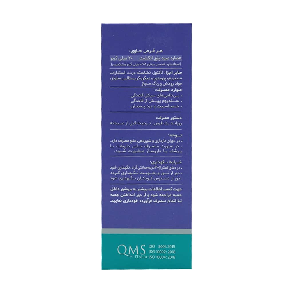 - قرص فمودین حاوی 20 میلی گرم عصاره گیاه پنج انگشت موثر در رفع اختلالات پیش از قاعدگی، دیسمنوره و یائسگی