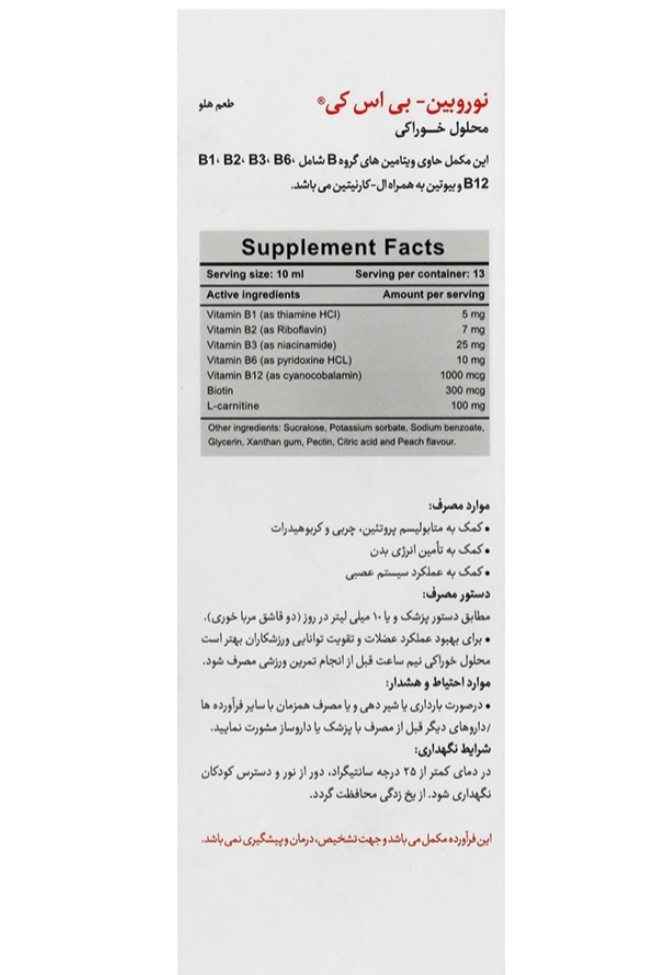 شربت نوروبین کمک به بهبود عملکرد سیستم عصبی نوروبین بی اس ای، حاوی ویتامینهای گروه ب و ال کارنیتین حاوی ال کارنیتین جهت کمک به تامین انرژی روزانه شربت نوروبین کمک کننده در بهبود متابولیسم درشت مغذیها فاقد قند و گلوتن، ارائه شده با طعم دلنشین هلو