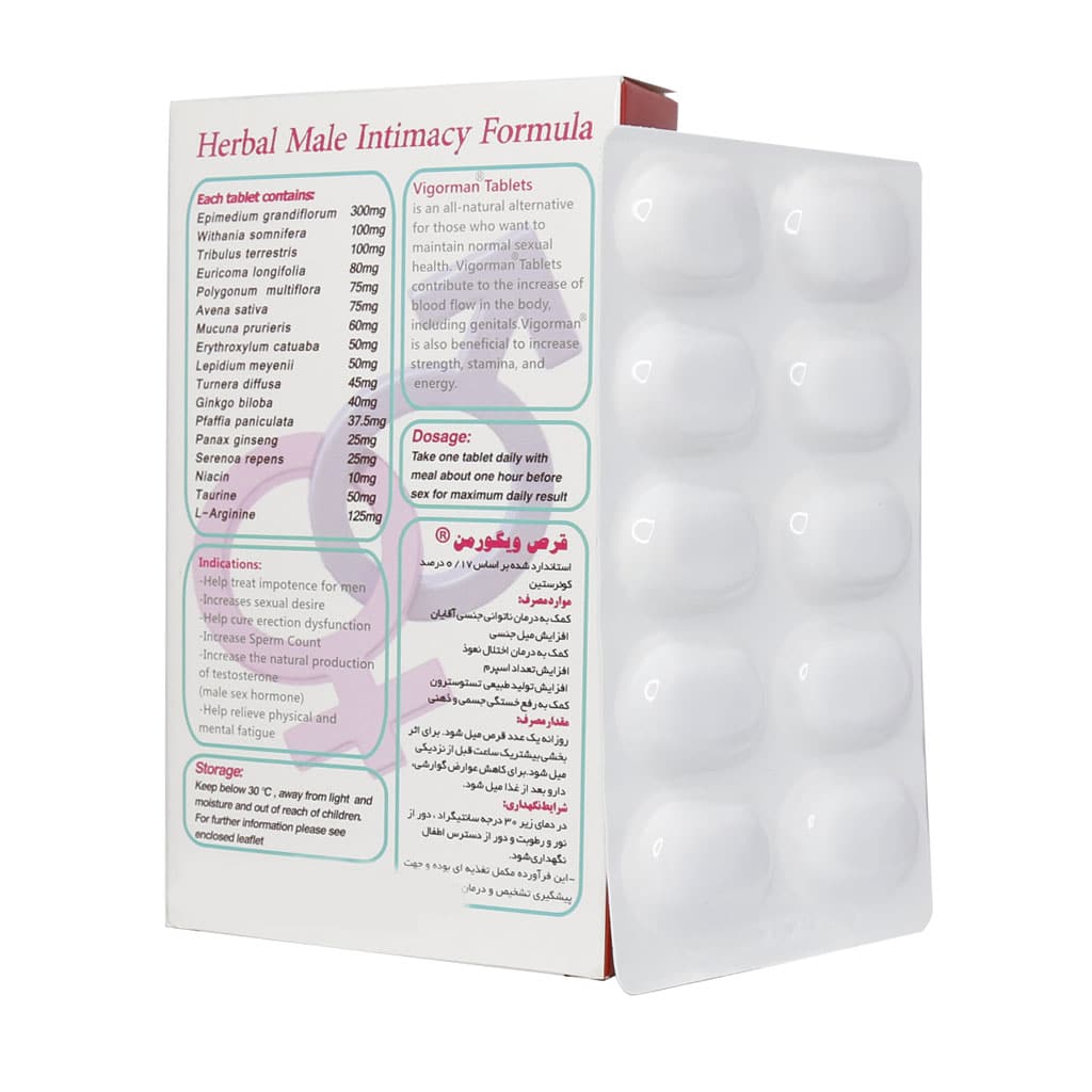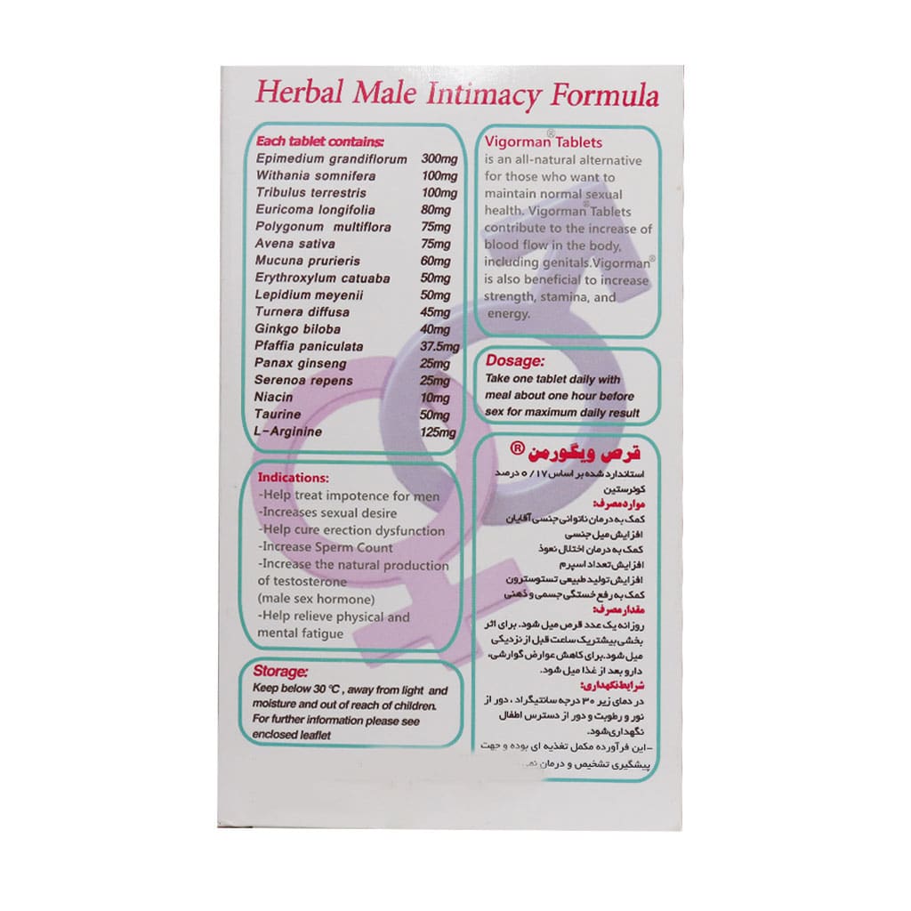 قرص ویگورمن، موثر در افزایش میل و قدرت جنسی مردان ویگورمن حاوی قوی ترین ترکیبات گیاهی موثر در تقویت جنسی مردان، نیاسین، تائورین و ال آرژنین افزایش انرژی به علت وجود نیاسین، تائورین، اپیمدیوم، آشواگاندا و جینسینگ رفع خستگی جسمی و ذهنی موثر در بهبود اختلالات نعوظ به دلیل داشتن ماکا، گیاه تونکات علی، خارخاسک و نخل اره ای موثر در سلامت اسپرم حفظ سلامت پروستات به واسطه داشتن نخل اره ای کمک به داشتن جریان خون طبیعی در بدن به ویژه اندام های جنسی غیر مجاز برای بانوان قرص vigorman به واسطه داشتن گیاه دامیانا و تریبولوس به ترشح طبیعی تستوسترون کمک می کند.