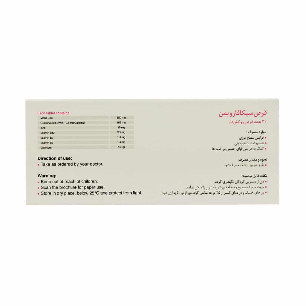 سیکافارویمن مکمل حاوی عصاره ماکا و گوارانا به همراه زینک، سلنیوم و ویتامینهای B2؛ B6 و B12 محصولی مفید برای افزایش قوای جنسی و بهبود عملکرد جنسی در خانمها کمک به تنظیم سطح هورمونها دارای اثرات مطلوب در تقویت سطح انرژی و کاهش خستگی قرص سیکافارویمن، دارای خواص آنتی اکسیدانی و تقویت کننده سیستم ایمنی کمک به سلامت عمومی خانمها