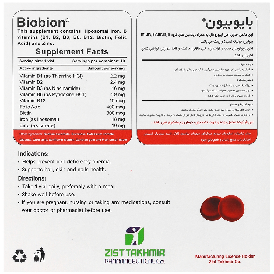 بایوبیون، ویال خوراکی برای پیشگیری و بهبود کم خونی فقر آهن ویال بایوبیون، حاوی آهن، ویتامین های گروه ب، اسید فولیک و زینک برای کمک به افزایش ساخت گلبول های قرمز کمک به کاهش خستگی و علائم کمبود آهن و بهبود انرژی روزانه بایوبیون، مفید در بهبود سلامت پوست، مو و ناخن ها فراهم کننده آهن لیپوزومال با جذب بهتر و حداقل عوارض گوارشی دارای سهولت مصرف و مناسب استفاده پس از جراحی های لاغری ویال Biobion، با طعم دلپذیر و جذاب پانچ میوه