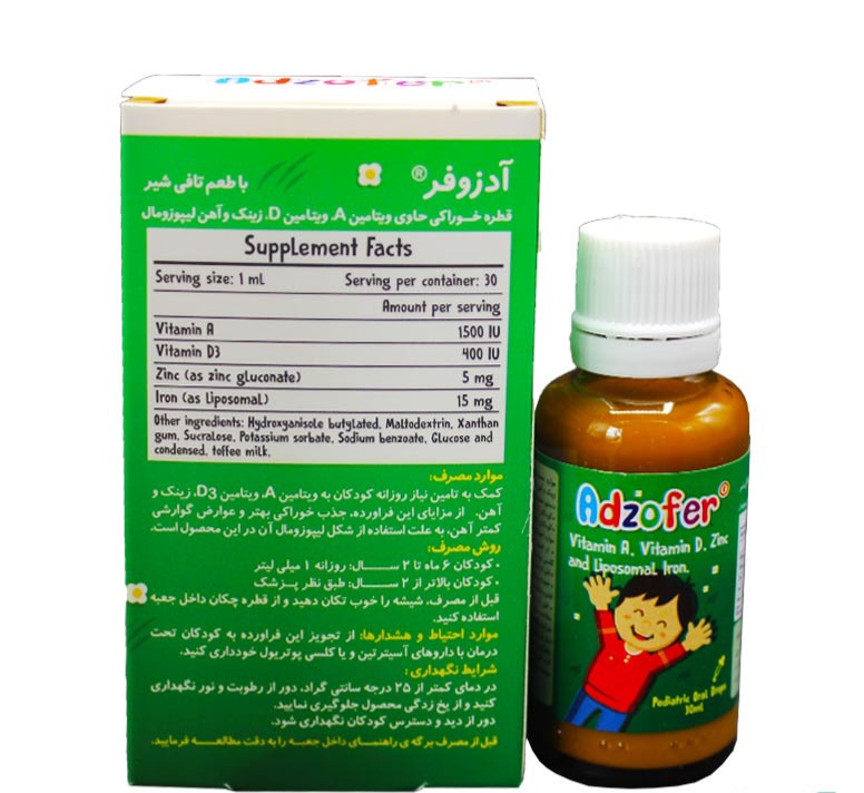 قطره آدزوفر، موثر در تقویت رشد کودکان قطره آدزوفر، کمک به تامین ویتامین A، ویتامین D، زینک و آهن در کودکان با جذب خوراکی بهتر و عوارض گوارشی کمتر به دلیل بهره گیری از آهن لیپوزومال در فرمولاسیون کمک کننده به بهبود رشد استخوان ها آهن لیپوزومال موجود در آدزوفر، موجب سیاه شدن دندان ها نمی گردد. قطره ادزوفر با طعم دلپذیر تافی و دارای قطره چکان، جهت استفاده راحت تر در کودکان